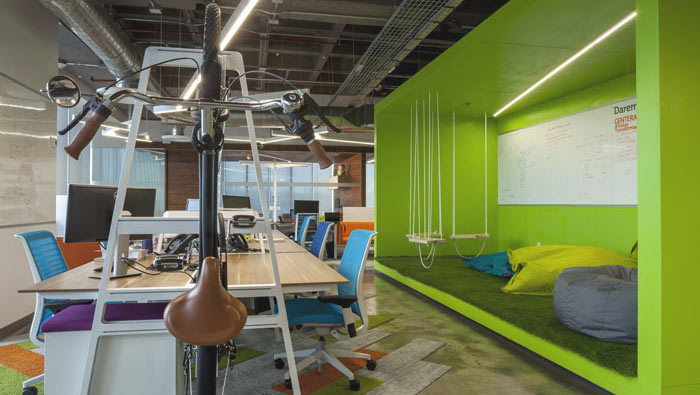 辦公休息區域的設計:此處的設計也可為是企業與設計師交流之后的產物,設計師在于業主交流的過程中,了解到業主希望讓員工可以在一個溫馨、舒適、有創意的空間中辦公,設計師苦思冥想之后采用“凹”字訣,讓員工在辦公累的時候可以停下來,蕩蕩秋千、以自己舒適的角度坐下,讓放松代替勞累的身心,做到排空的效果。