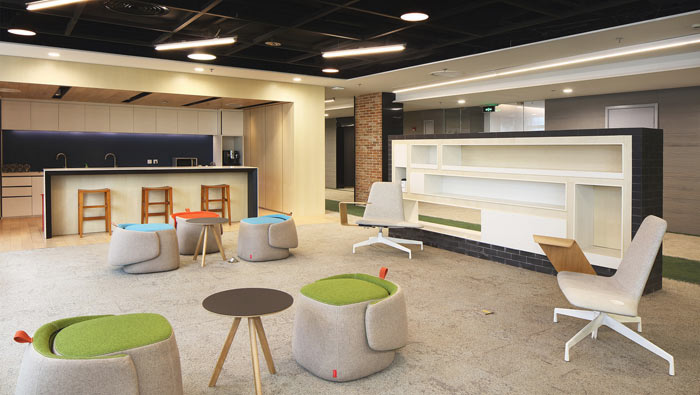 茶水間的設計:設計師在設計的時候,充分采用了放松的屬性,設計師希望為企業營造一個放松身心的空間,在設計師看來放松是企業必須需要重視的一個問題,只有放空才能裝進新的東西,只有這樣才能使員工不斷的成長,設計師希望通過這種不規則的空間來打破日常生活對于員工的束縛。