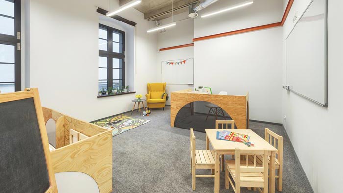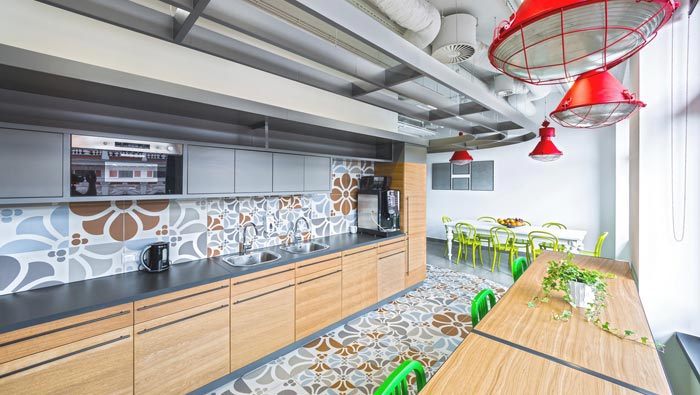 茶水間的設計:設計師在設計的時候,將茶水間與休息區域很好的融合在一起,茶水間與休息區域的設計完全都是倚邊而建,這樣的設計反而將中央區域保留了下來,這條線在設計師眼中是一塊天然的動線,去中心化的設計也解決了空間的動線問題。