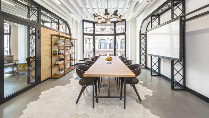 會議室的設計:設計師在設計的時候,一樣將其安置在獨立的空間之中,同時由于企業內部員工人數有限,故此在設計中設計師希望為企業保留一個活動的會議空間,讓員工在此處可以有更大的發揮空間,空間在窗戶的延伸之下顯得格外寬敞,讓人的思維可以不受阻隔的進行分散與重合。