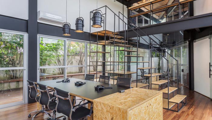 loft風格辦公室會議室設計:設計師將會議室安置在此處,是因為此處的采光極好,對于會議的開展十分有好處,同時此處也位于室內與室內的交界處,室外的景色也在不時的影響室內。