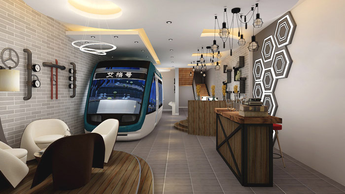一樓區(qū)域的設計,設計師是在一次等待動車的時候來的靈感,看著快速從眼前小時的動車,速度是如此的快速,眨眼間消失在設計師的眼前,設計師觀此覺得這與現(xiàn)實的互聯(lián)網(wǎng)一樣,以快速的節(jié)奏發(fā)展,讓人始料未及,設計師希望通過動車式的設計讓企業(yè)在以后的發(fā)展中可以乘著快速駛來的車向前飛躍。
