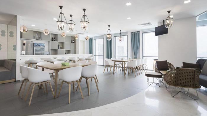 茶水間的設(shè)計(jì):此處位于一個(gè)開(kāi)放的空間之中,在設(shè)計(jì)中設(shè)計(jì)師將茶水間安置在空間的一側(cè),這樣設(shè)計(jì)的目的就是釋放更多的空間,為茶水間的輔助功能讓位,輔助功能就是休息場(chǎng)所、交流場(chǎng)所,設(shè)計(jì)師這樣做的目的就是希望將空間發(fā)揮到最大化,讓員工有更多減壓的場(chǎng)所。
