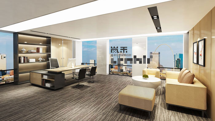 董事長辦公室的設計,設計師為了統一的風格,最后將風格總結為六個字:大氣、簡約、時尚,另外在其中設計師加入了運籌帷幄的元素,讓董事長可以在辦公室中鎮守公司財運。