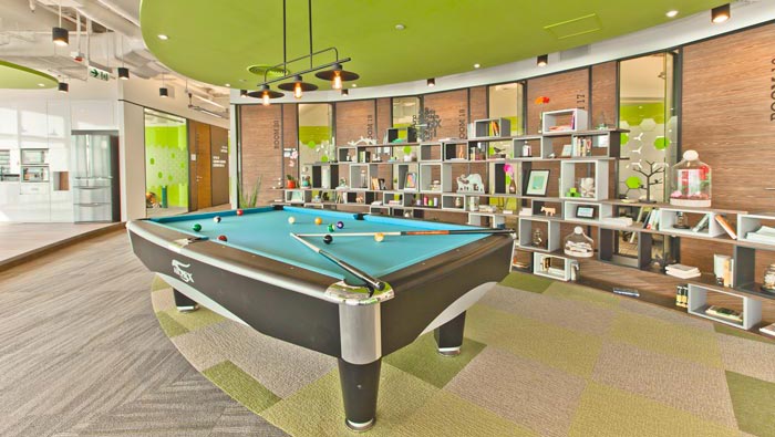 現代簡約辦公室娛樂區設計:此處是讓大家從繁忙的工作中解放出來,能放置在室內的娛樂項目本身就不多,能放置在辦公室中的娛樂項目更是少之又少,臺球就是一個不錯的選擇,因為臺球是一項老少皆宜,適合于各文化層次的既富有消閑性又具有知識性的球類活動。
