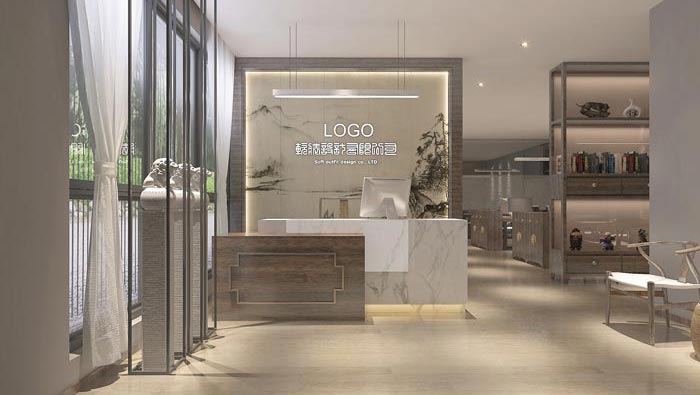 前臺的設計:設計師在設計之初,對戶外的采光進行了仔細的研究與比對,最后在中式風格的前提下采用了淺灰色做為主色調來設計,這樣設計的目的就是希望把握內外之間的平衡,讓室內如室外的感覺如出一轍,讓客戶在進入空間后不會產生突兀的感覺,仿佛如行云流水一般的自然。