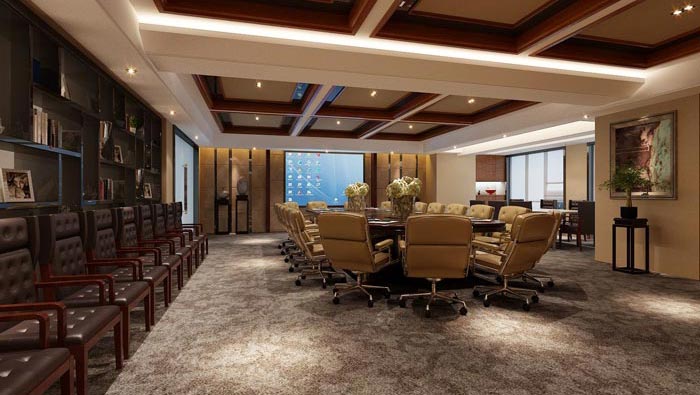 大型會議室的設計:此處主要是為了企業內部與商業交談所設,目的一來是為了展現企業的實力,二來也是打造一個清靜的會議空間,此會議室是一個集成的空間,既滿足會議的開展,也設置了休息區和交流區,目的就是希望為會議的順利開展起到輔助作用。