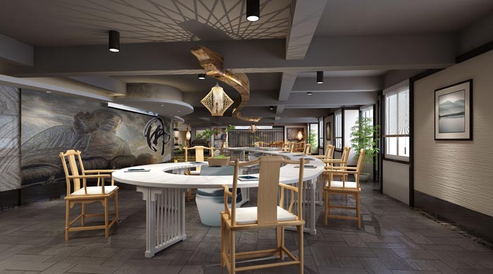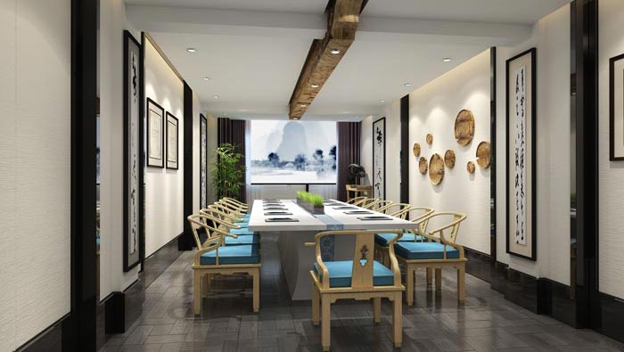 會議室的設計:中式風格本身就是古人對于自然的理解,也是古人對于為人處世具象化的一種表現,故此設計師希望中式的布局可以為企業帶來一次心靈的升華,嚴謹的空間布局、沉穩的空間氛圍盡顯古人嚴謹的作風,設計師希望員工可以繼承中華文化的精髓,不斷自我成長、不斷在工作中尋求突破。