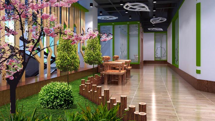 過道的設計:此處有綠植、花草、木制柵欄可謂十分齊全,其中最引人關注的是那一顆含花待放的桃花,看到那花蕾媽紅小巧的桃花,給人的是一種觸動,不由自主的融入那花愫中,去感受桃花的生命,另外桃花粵語中“宏圖”與“紅桃”同音,桃花寓意“大展宏圖”。