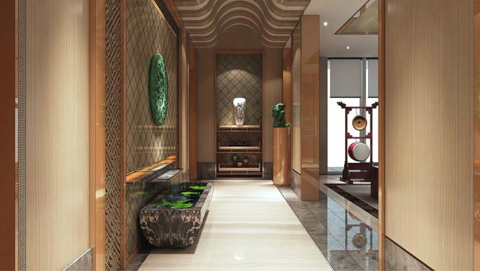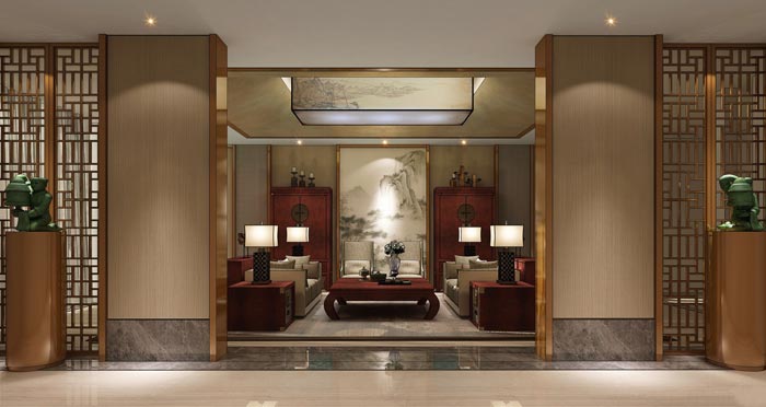 接待區域進門區的設計:此處是接待區域與進門區域的連接處,進門區域通過一個轉彎就可達到此處,門的設計也非常有講究,要開多大、要有多高都有其特殊的寓意,透過門看進室內首先映入眼簾的就是山水畫,此畫極注重象外之意,其中含義既含情又寓理,給人以畫外聯想,其次就是多元化的中式家具,賦予空間不同的審美。