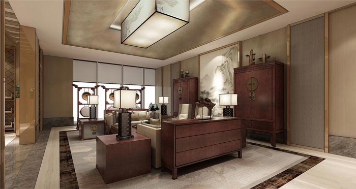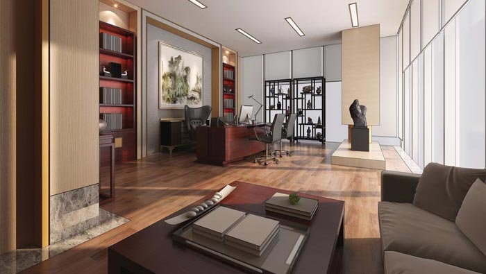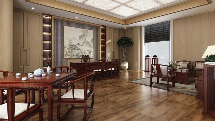 總經理辦公室的設計:此處重點在于展現人與空間、物與空間、空間與自然之間的關系,其中中式后現代家具以其優美的線條,多變的曲線,靈秀的圖案,點到為止的制作技藝,在加上符合現代人需求的時尚元素和個性化,令審美視線不斷跳躍,古樸和時尚融為一體。