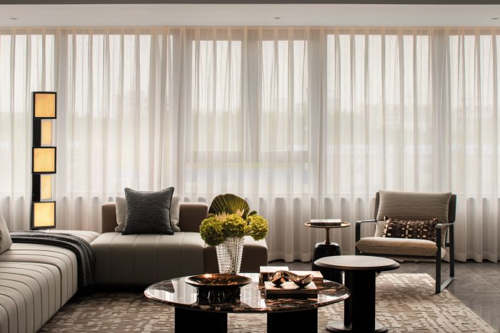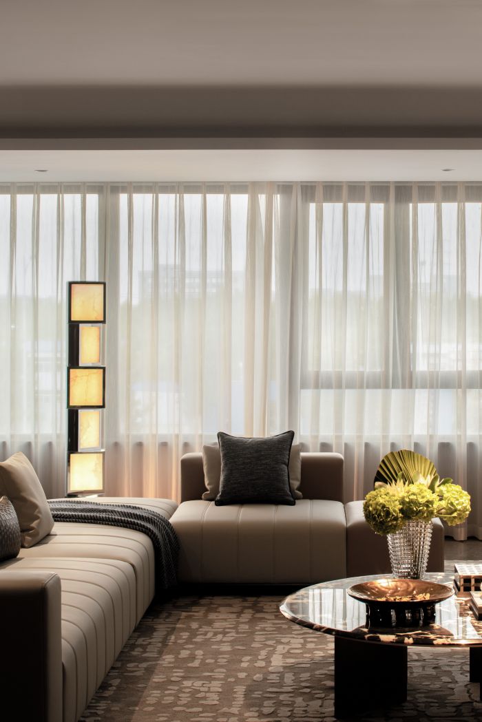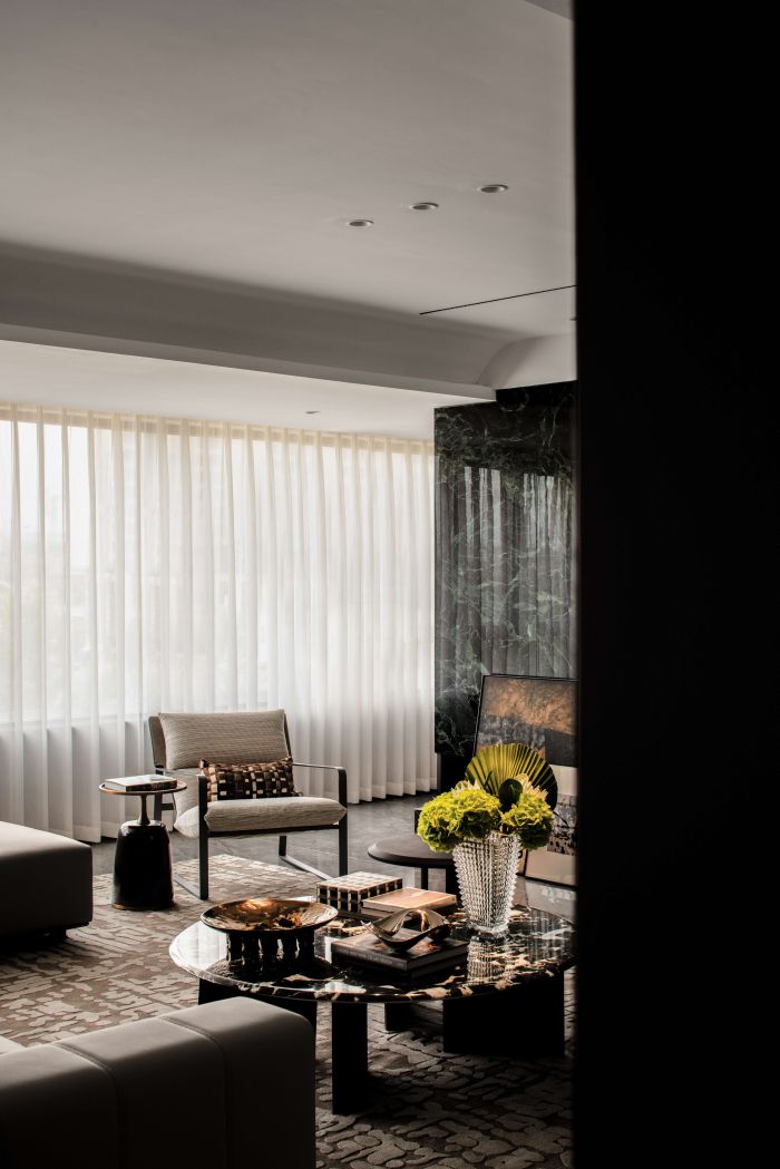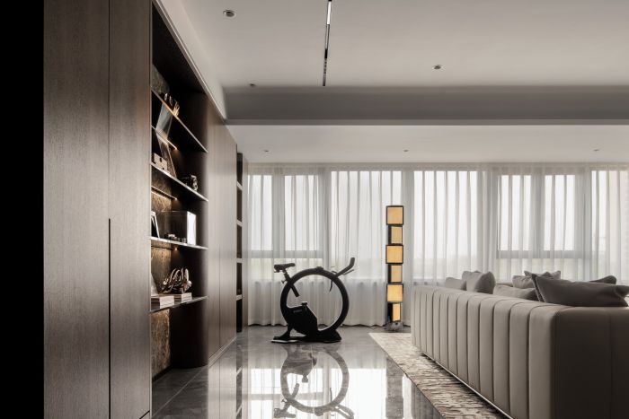 客餐廳整體風格現(xiàn)代輕奢,設計語言采用直線條為主,塊面的分割,給人以簡潔大方的感受。客廳空間整體方正且視野開闊,劃分為會客廳及有氧多功能區(qū)一體,自由且舒適,餐廳區(qū)域為開放式餐廳,中餐及西式操作臺結合,實現(xiàn)不同的功能需求。地面材質公共區(qū)域大面積采用深灰色網紋石材鋪貼,大氣穩(wěn)重。