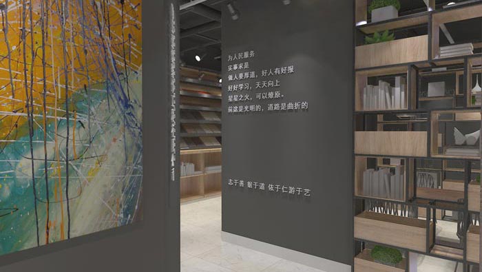會(huì)議室的設(shè)計(jì):此處位于兩個(gè)展示隔斷的中間區(qū)域,這也是唯一一個(gè)可以利用的空間,由于空間面積有限所有多元化的設(shè)計(jì)就十分必要,隔斷對(duì)外可以阻隔實(shí)現(xiàn),對(duì)內(nèi)可以起到墻體的作用,同時(shí)也不會(huì)對(duì)整個(gè)空間造成影響,反而對(duì)空間形成了一個(gè)互補(bǔ)的格局。