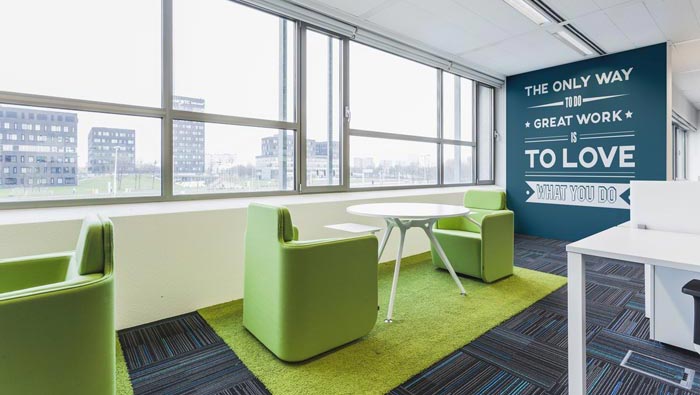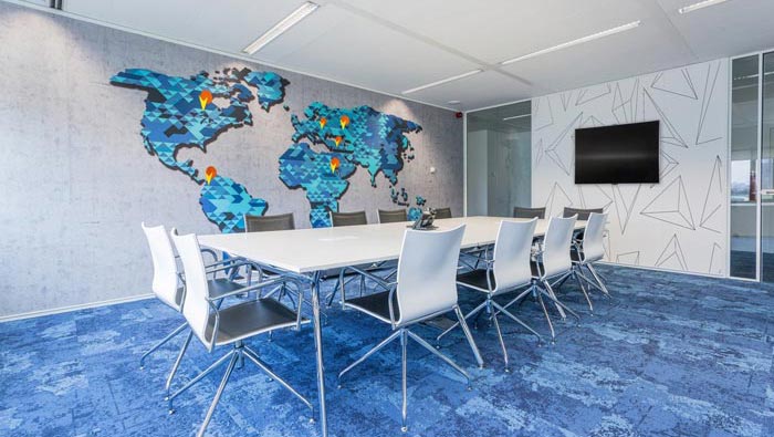 大辦公室的設計:設計師在設計的時候,將其安置在一個大的開放空間之中,設計師采用取中的設計原則,在設計師看來取中可以將思緒全部集中在會議區域,同時地毯設計師采用了類似海洋的顏色,以此寓意企業順風順水,同時這樣的設計將此處的向心力更加集中于中間部位,不會因為分散導致空間顯得空曠。