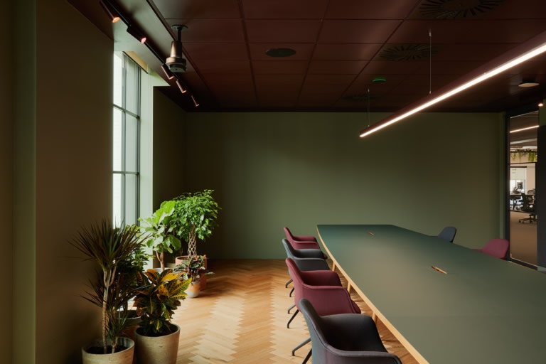 幸福是設(shè)計(jì)的核心。“花園小徑”背后的想法是鼓勵(lì)人們多休息一下,舉行步行會議。這個(gè)概念被設(shè)計(jì)成天花板上掛著植物和樹葉的花園,形成了一條超越生物因子的頭頂通道,在整個(gè)空間中充當(dāng)著尋找出路的角色。在一間有可移動(dòng)墻壁的大房間旁邊,創(chuàng)建了一個(gè)禪修室,供冥想、祈禱和放松之用,以便白天有空間進(jìn)行培訓(xùn),以及業(yè)余普拉提和瑜伽工作室。
