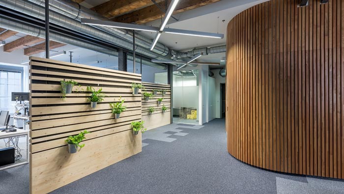 節能技術公司辦公室動線設計:木制隔斷是空間的一大亮點,這也是設計師根據玻璃隔斷的缺點特意改進的,木質隔斷不僅有玻璃隔斷的優勢,同時本身與整個空間也更加搭配,綠植的點綴讓空間更加有活力。