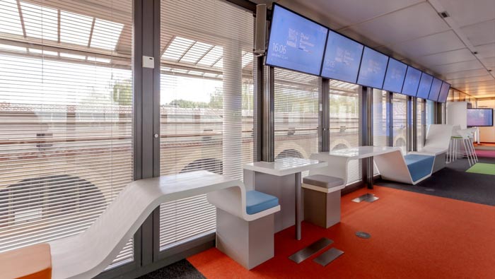 環(huán)境監(jiān)測公司辦公室茶水間設(shè)計(jì):茶水柜成九十度分布,圓形的休息桌讓空間有了重心,墻面上的顯示器可以時(shí)刻將數(shù)據(jù)傳送到此地,讓檢測無處不在,讓檢測更加便捷,休息與辦公完美融合。