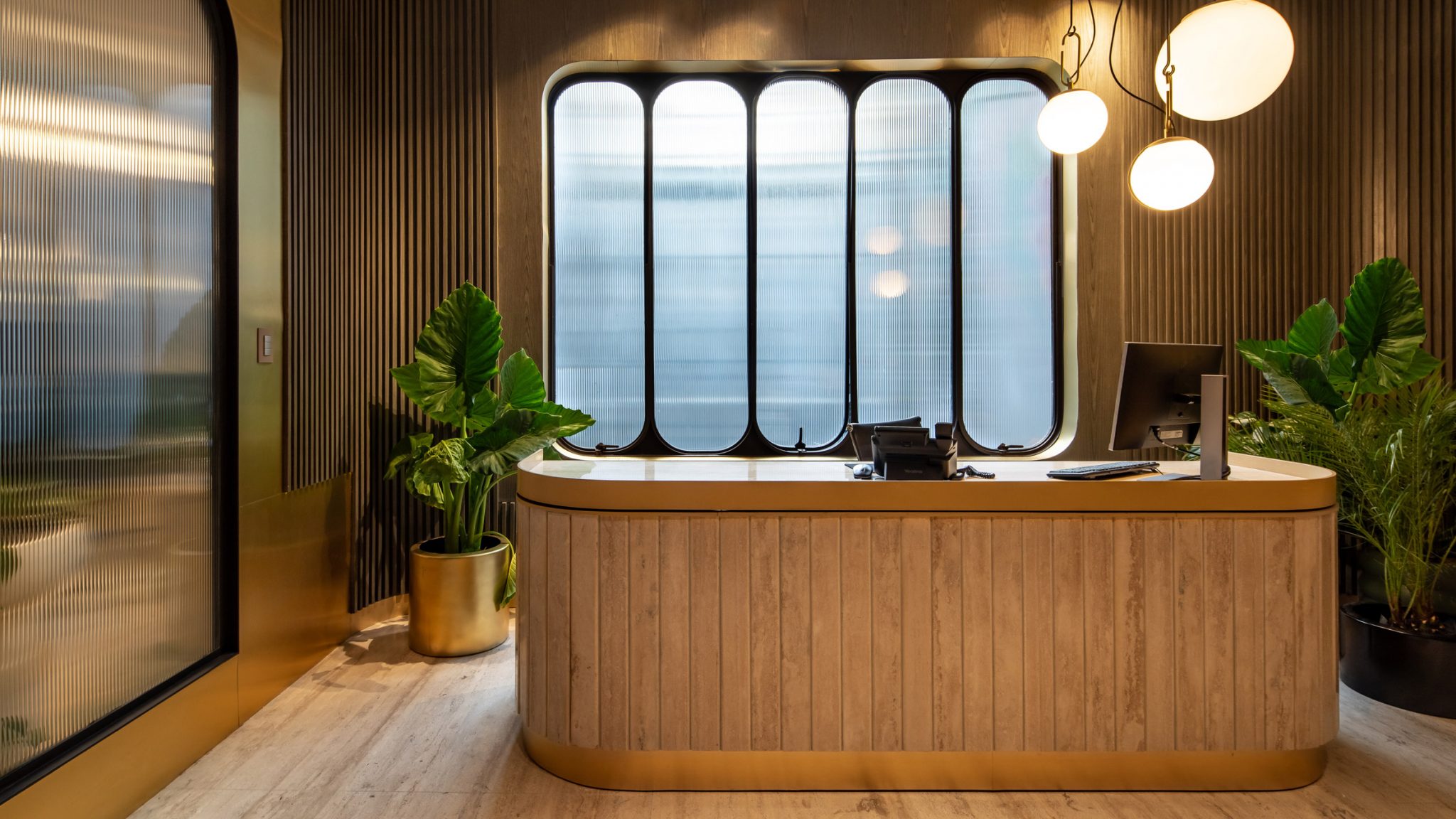 前臺基本上就奠定了一個整個室內空間的風格樣式,典型的墨西哥復古風格,彎曲的窗戶與大理石還有金色的飾面宣告著復古情懷。