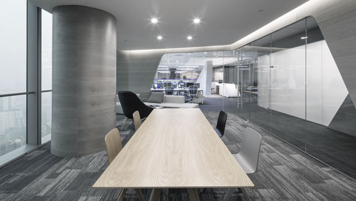 培訓機構校長辦公室設計:此處三面環繞落地窗,讓室內與室外保持真正意義上的零距離,在校長辦公之余可以俯視整個城市的美景,這樣的方式不僅可以緩解辦公的壓力,同時也在逐漸養成一個人的大局觀,設計師希望設計可以變相的促進一個人的成長。