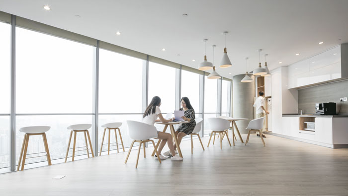 培訓機構辦公室茶水間設計:空間呈三角形分布,一個斜面做為茶水區,一個斜面做為門口,另一個斜面與外界保持零距離,設計師希望教師們在這里,一邊喝著咖啡、一遍欣賞著外界的美景,同時也可以在這里討論學習進度,互相的分享心得,在彼此交流中互相成長。