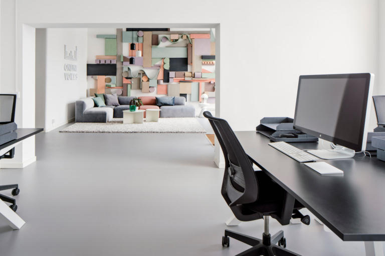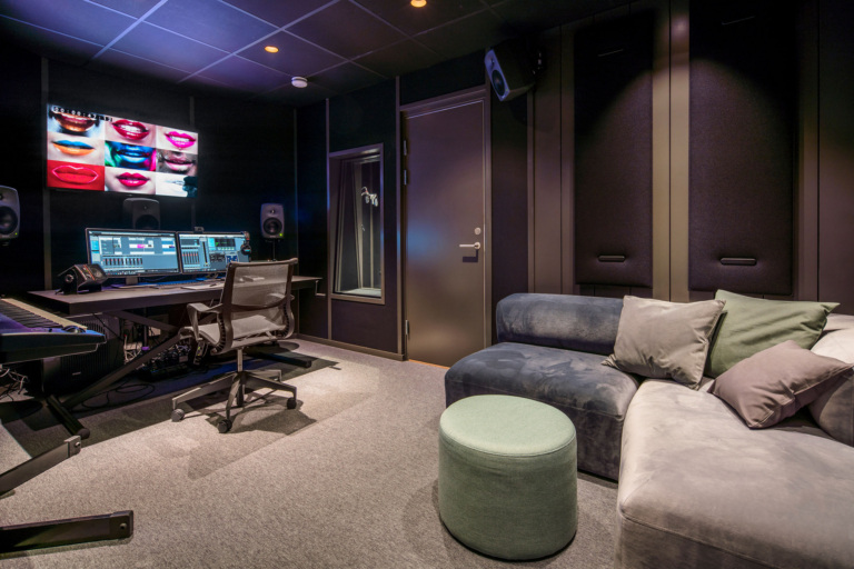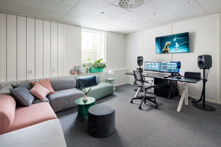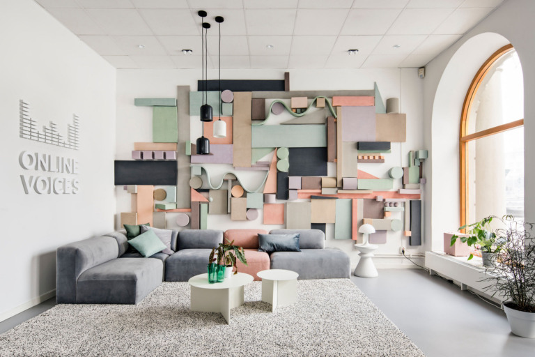 一種新的和創(chuàng)造性的方式使用聲學(xué)面板、穿孔金屬和金屬網(wǎng)。研究了聲音及其背后的技術(shù),并在整個(gè)辦公室的色彩、形狀和材料方面運(yùn)用了這一靈感。在休息區(qū)的墻壁上,創(chuàng)造了一個(gè)帶有彩色音響面板的裝置,以及一個(gè)混合控制臺(tái)按鈕的靈感設(shè)計(jì)。類似的細(xì)節(jié)可以在辦公室里找到,也可以找到設(shè)計(jì)的其他東西,比如一盞聲波形狀的燈。