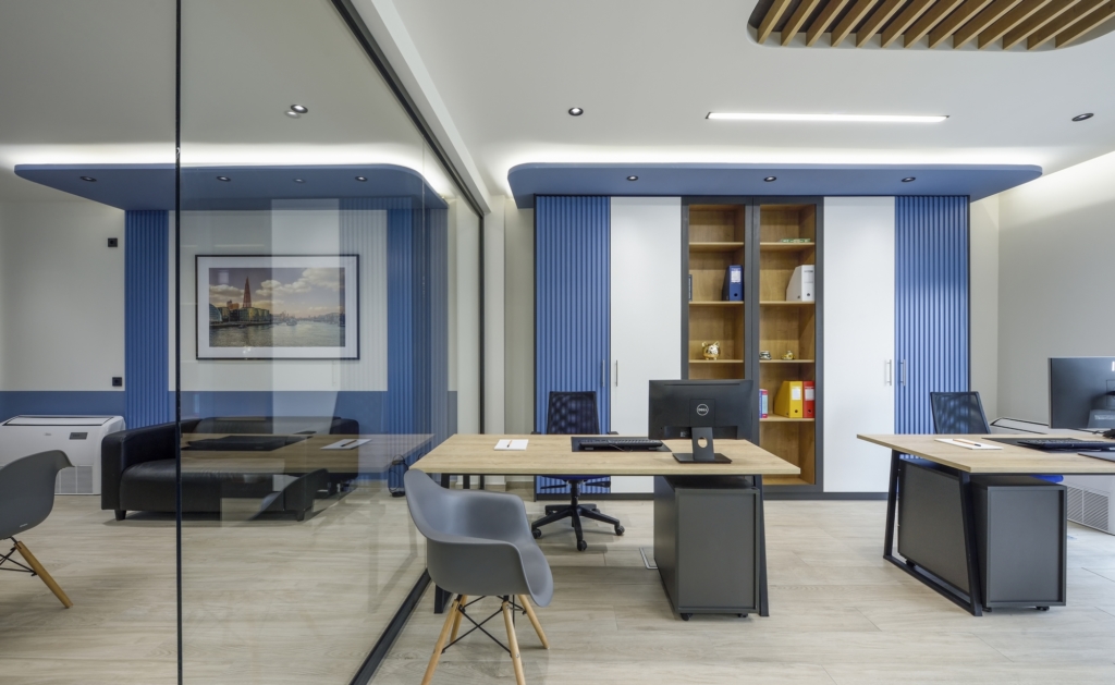 最小的線(xiàn)條勾勒出空間中的運(yùn)動(dòng),而圓元素則使所有的邊緣更加平滑。與辦公設(shè)備的最大比例有關(guān)的特殊建筑,緊跟設(shè)計(jì)標(biāo)識(shí),提供額外的存儲(chǔ)功能。