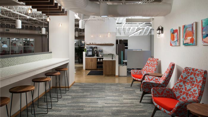 700平方辦公室吧臺設(shè)計:在這里員工們泡上一杯咖啡,坐在吧臺前慢悠悠的品嘗著,生活好不悠閑,這也是設(shè)計師給員工的一個福利,經(jīng)過設(shè)計師的實踐,設(shè)計師發(fā)現(xiàn)慢悠悠的生活可以促進(jìn)人的思維提升,在慢悠悠的生活中靈感也比平時要來得快,這樣的生活向我們闡述了什么是真正的勞逸結(jié)合。