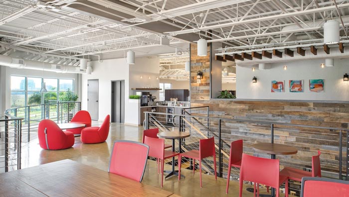 700平方辦公室休息區(qū)設(shè)計:一樓客戶感受到企業(yè)的實力與誠意,當(dāng)一步一步走上二樓之后,感受到的是另外一番場景,在這里陽光投射在空間之中,一股暖洋洋的感覺撲面而來,這是設(shè)計師對于光的理解,因為有了光萬物有了色彩,故此設(shè)計師希望讓客戶直觀的感受到光的魅力。