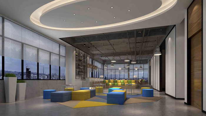 休息區域的設計,設計師打破了大空間所帶來的冰冷感,設計師在其中加入了色彩與燈光進行中和,讓冰冷的空間瞬間融化,壓力在此處得到充分的釋放。