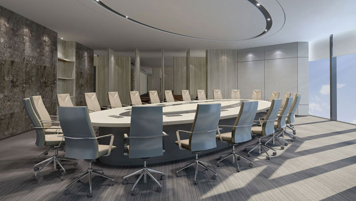 會議室的設計,設計師根據建筑本身的特點,將會議室很好的嵌入一個不規則的空間中,設計亮點一則采光、二則俯視整個城市,給人以豪氣。