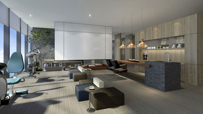 茶水間的設計,設計師在其設計的時候,對空間一分為三,一則休息、二則茶水間、三則活動區域,讓員工在此處可以釋放壓力,以更好的投入工作。