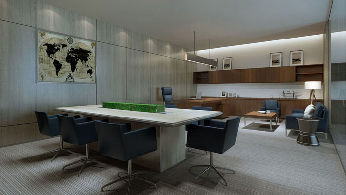 總經理辦公室的設計,設計師根據與總經理本人的交流,了解到總經理本人喜歡清靜,另外希望可以將空間加入小型會議室,最后設計師將會議室與辦公室完美的結合在一起。