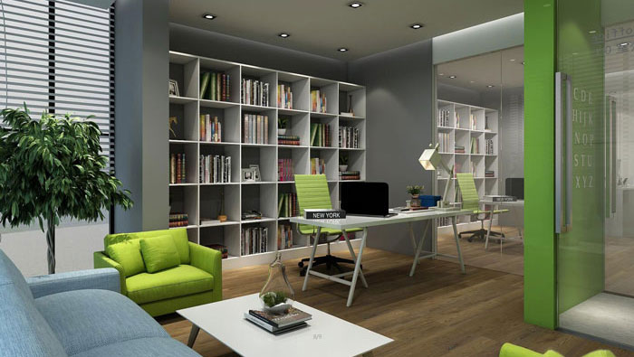 總經理辦公室的設計,整體空間以綠色為視覺基本基調,空間集工作、閱讀、討論與休憩于一體。